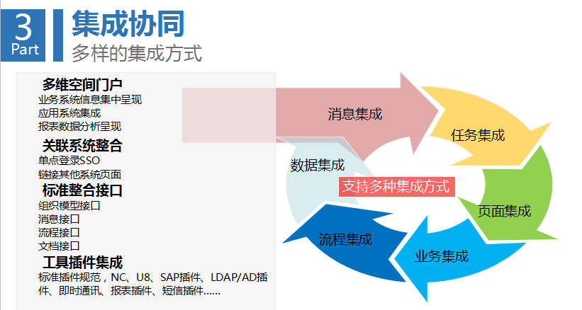 第三環(huán)是集成協(xié)同。任何企業(yè)都在多個(gè)系統(tǒng)中間,要思考多個(gè)系統(tǒng)之間怎么把數(shù)據(jù)共享起來?怎么把信息整合起來?怎么產(chǎn)生通用的信息門戶,能達(dá)到更高效的信息推送和自動(dòng)推薦?