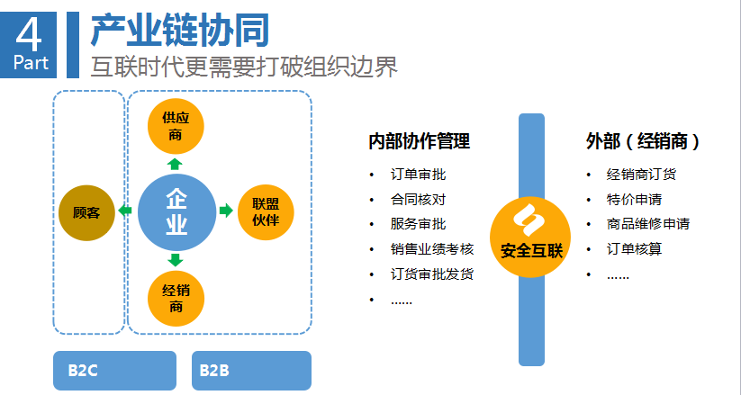第四環(huán)是產(chǎn)業(yè)鏈協(xié)同。企業(yè)要在生態(tài)中間完成協(xié)作,比如說供應(yīng)鏈、訂單、交易、分享的協(xié)作,企業(yè)的生態(tài)和上下游之間要完成相互協(xié)作。